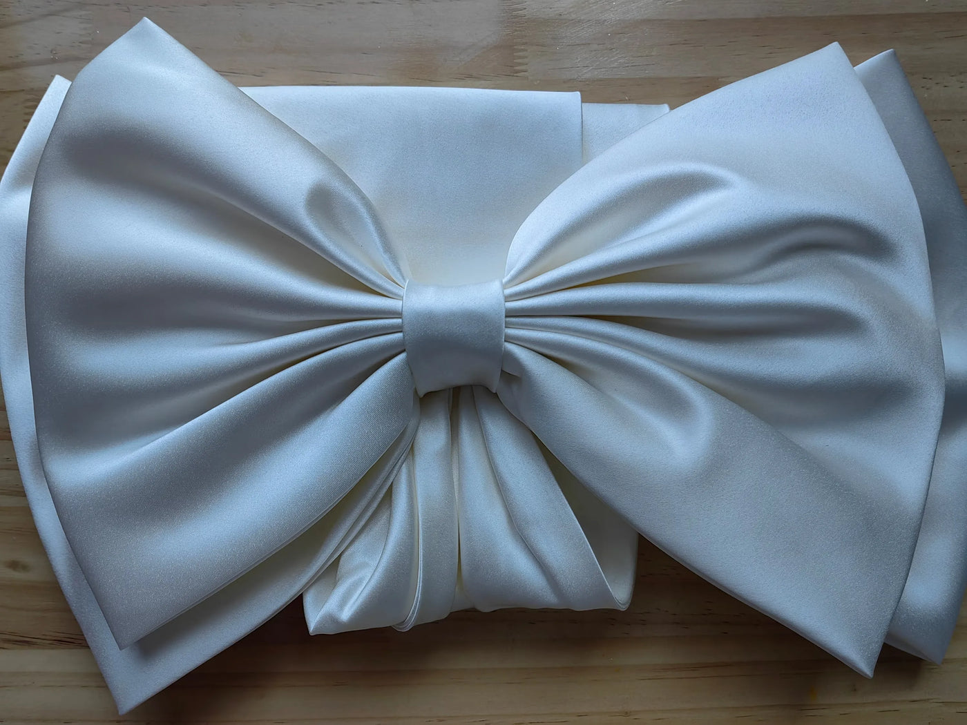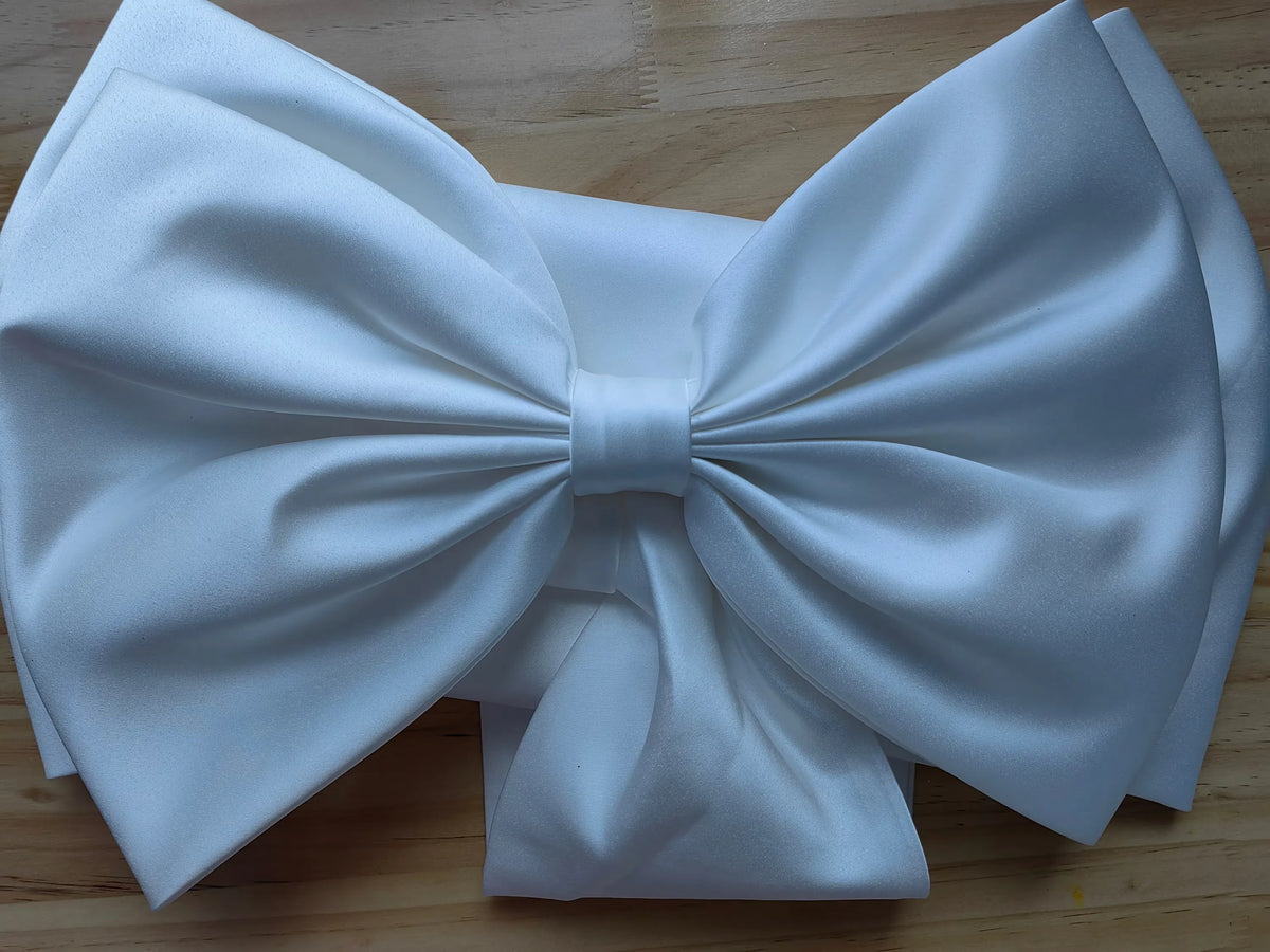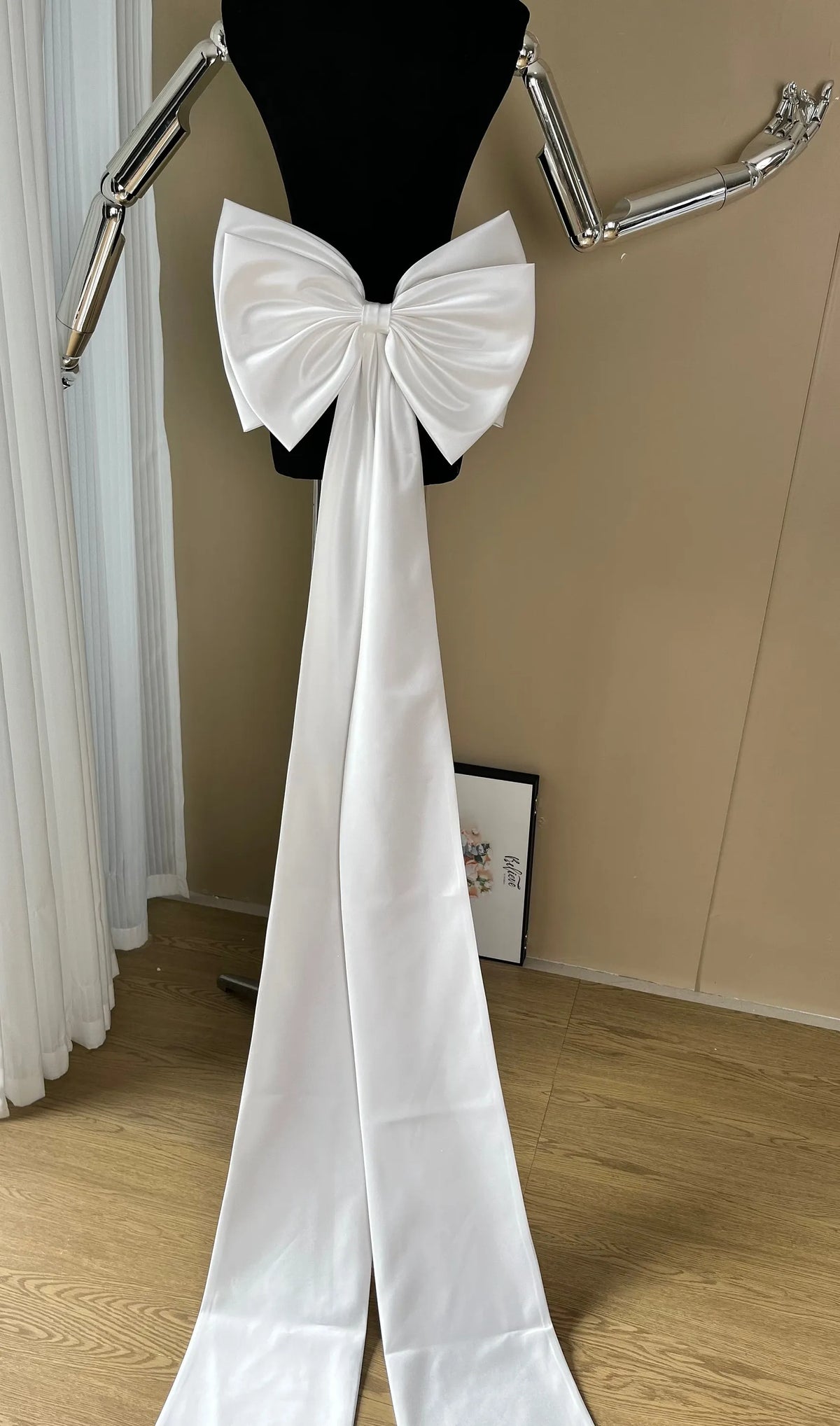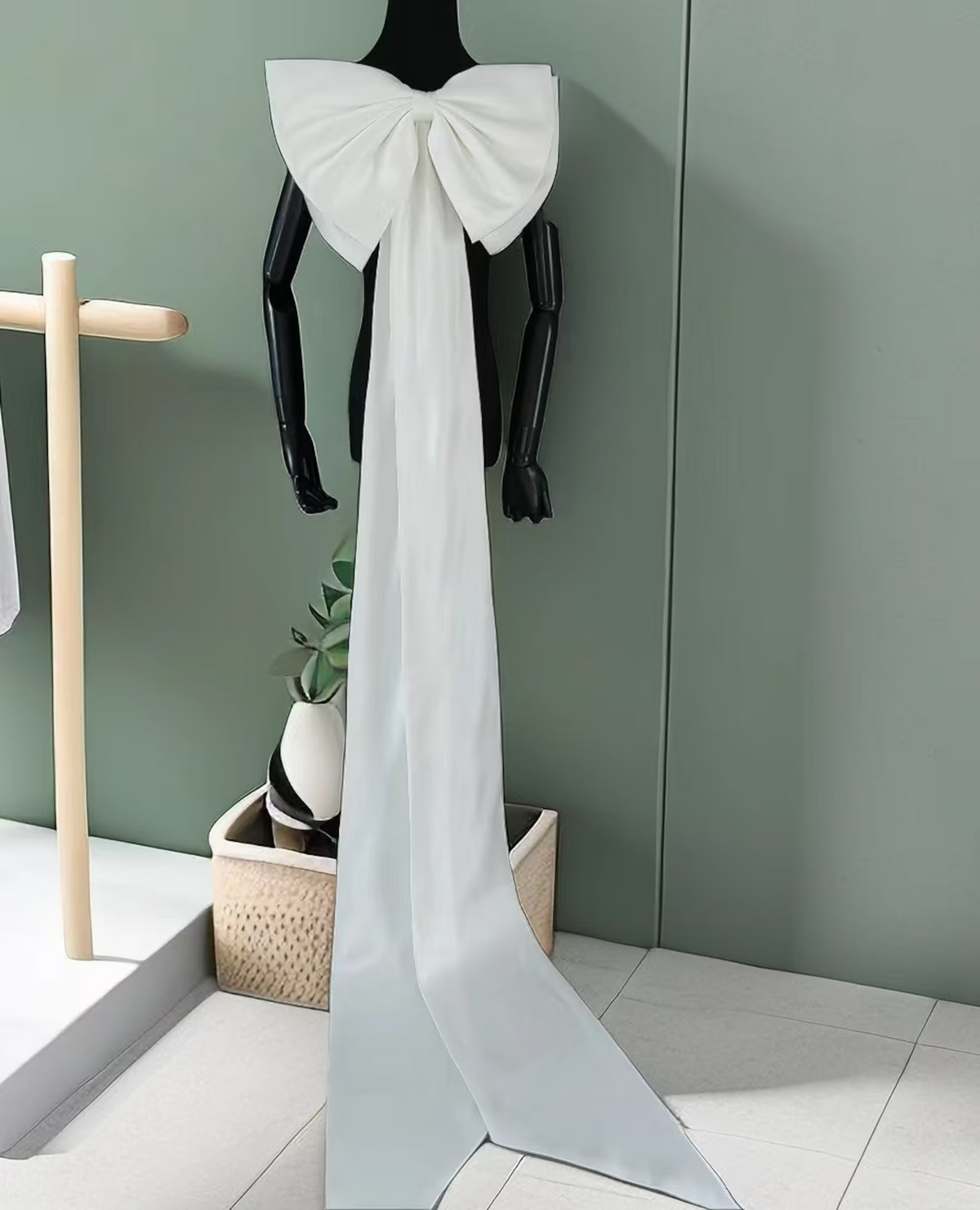 Elevate your formal look with this white satin oversized bow back accent. It features a bold, layered bow design crafted from sleek satin fabric, creating a dramatic and eye-catching detail. The voluminous silhouette adds avant-garde allure, making it perfect for bridal gowns, statement dresses, or any occasion where you want to blend timeless elegance with bold, fashion-forward charm.