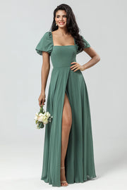 Chiffon Puff Sleeves A Line Green Bridesmaid Dress