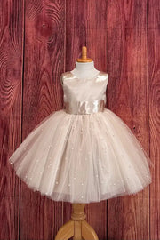 This charming flower girl dress features an elegant A-line silhouette with a round neckline and sleeveless design, perfect for weddings and formal occasions. Delicate pearl accents enhance the bodice, while the unique V-back is beautifully finished with a bow for added sophistication. Designed for comfort and style, this dress is ideal for flower girls, communion ceremonies, or as a princess-inspired formal dress. Its timeless design ensures your little one looks graceful throughout the event.
