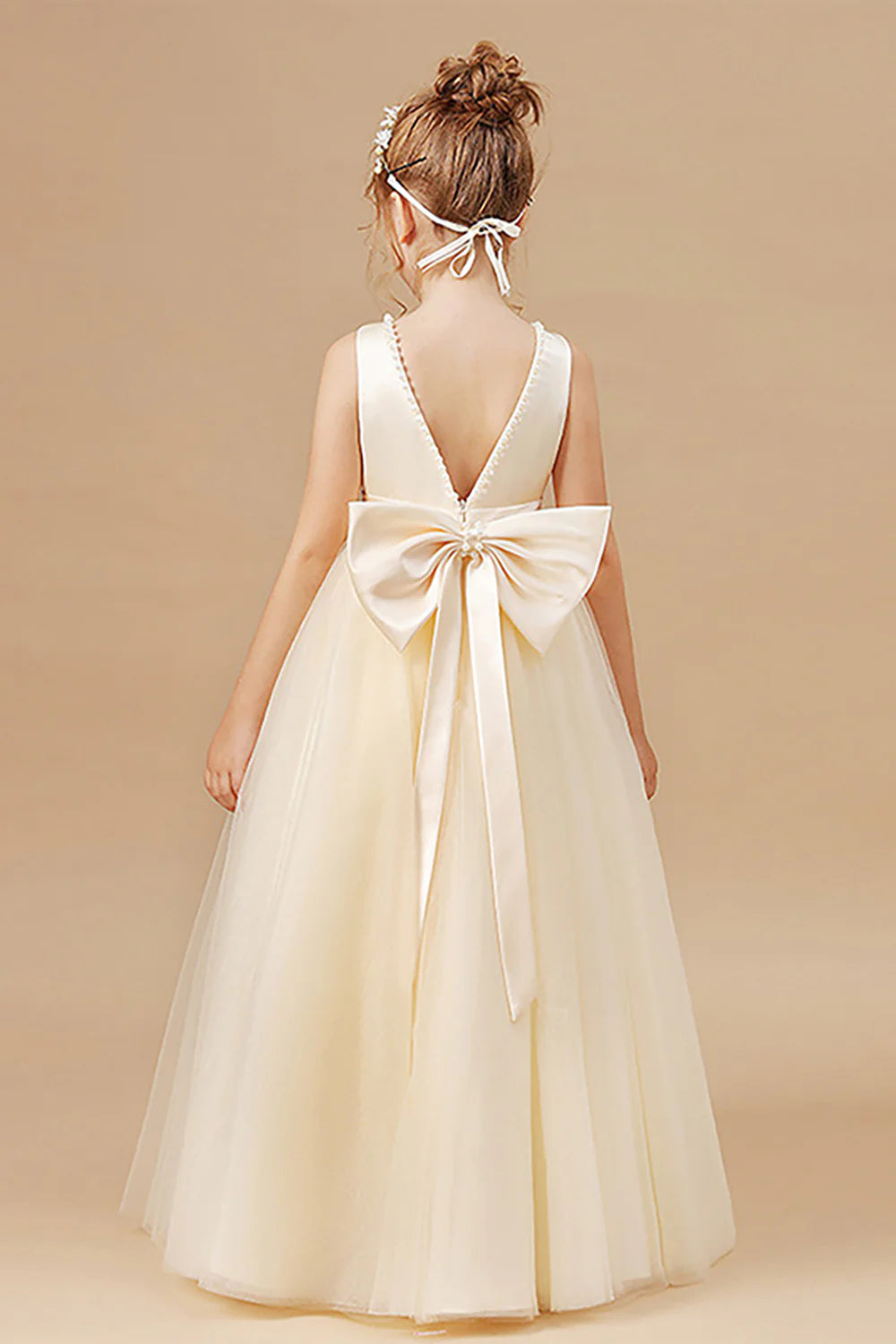 White A Line Sleeveless Bowknot Flower Girl Dress With Pearls - Child 2 / Champagne