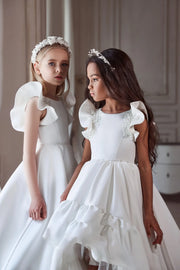 This gown showcases impeccable couture craftsmanship with its voluminous ruffle sleeves, artful floral appliqué along the bodice, and a unique hi-lo silhouette that reveals soft tulle layers beneath. The dramatic cathedral-length train is framed with gathered ruffle edging for a truly regal finish. The back stuns with an illusion mesh panel, embroidered lacework, and delicate button detailing—an unforgettable design meant to captivate from every angle. Whether gracing the aisle as a flower girl, celebrating a First Communion, or attending a formal event, Alexis is the embodiment of luxury and youthful grace. A timeless treasure for girls who dress with poise, confidence, and couture flair.