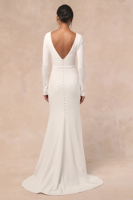 This gown features a sleek V-neckline, form-fitting long sleeves, a luxe stretch crepe bodice, and a mermaid silhouette with a sweeping chapel train. The romantic open back is finished with delicate fabric-covered buttons, balancing minimalist sophistication with subtle allure. It is ideal for winter weddings, city hall ceremonies, or intimate bridal events.