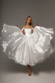 Chic Off the Shoulder Ruched Tea Length Ankle-Length Wedding Dress - US 2 / UK 6 / EU 32
