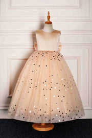 Wedding Flower Girl Dress Sparkle A Line Round Neck Sleeveless V-Back BowSequined Cute Girl Communion Formal Dress Princess Dress